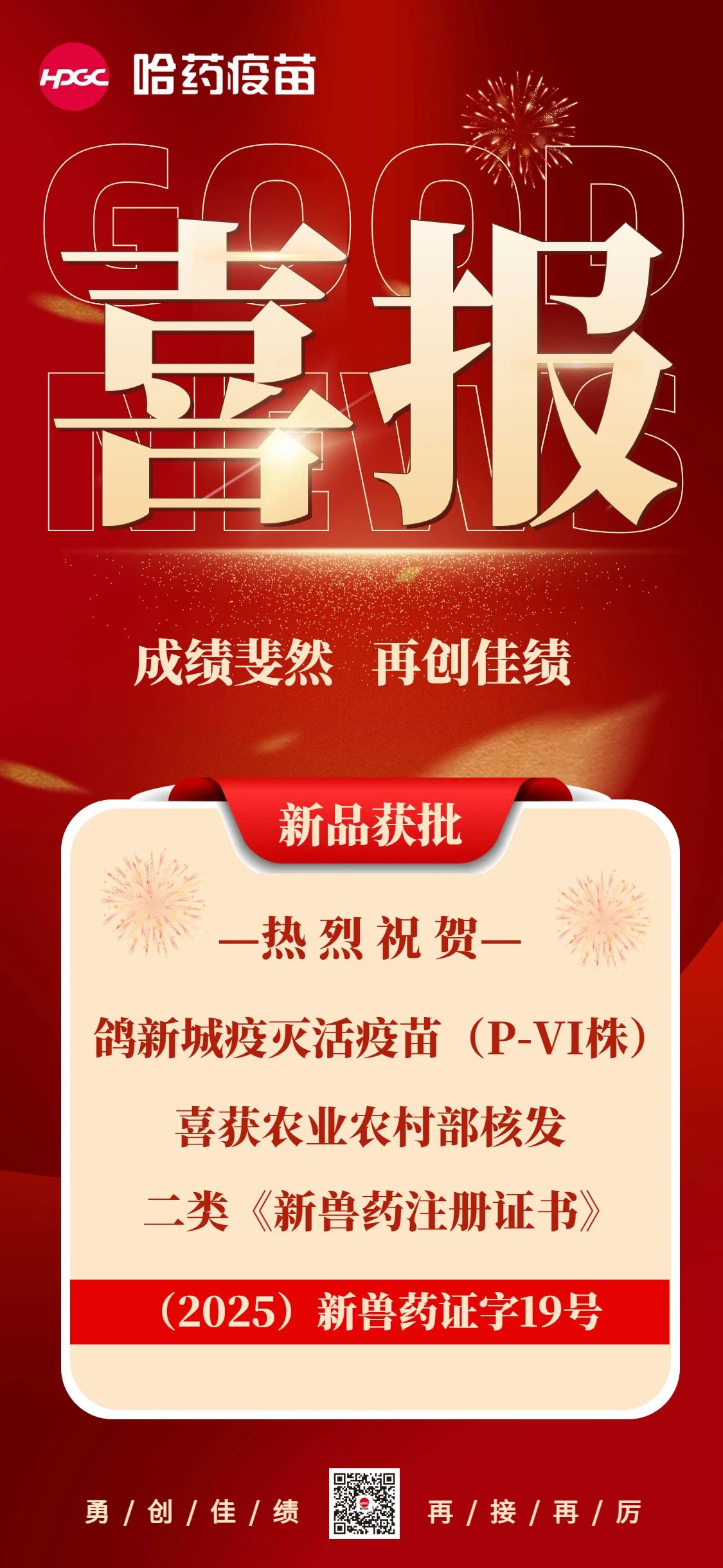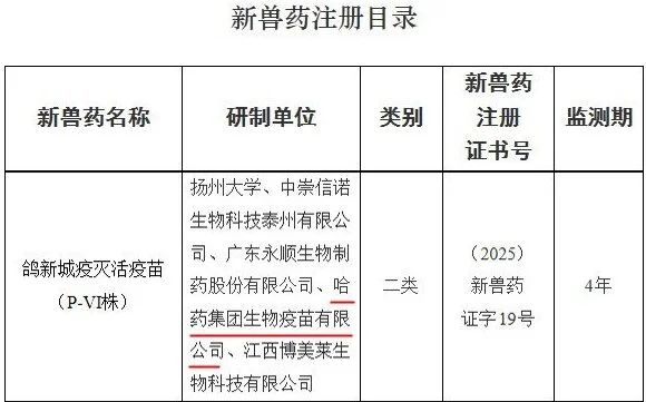根據(jù)《獸藥管理條例》和《獸藥注冊辦法》規(guī)定,經(jīng)農(nóng)業(yè)農(nóng)村部審查,批準哈藥集團生物疫苗有限公司申報的“鴿新城疫滅活疫苗(P-VI株)”為新獸藥,并于2025年03月24日公示并核發(fā)了《新獸藥注冊證書》。